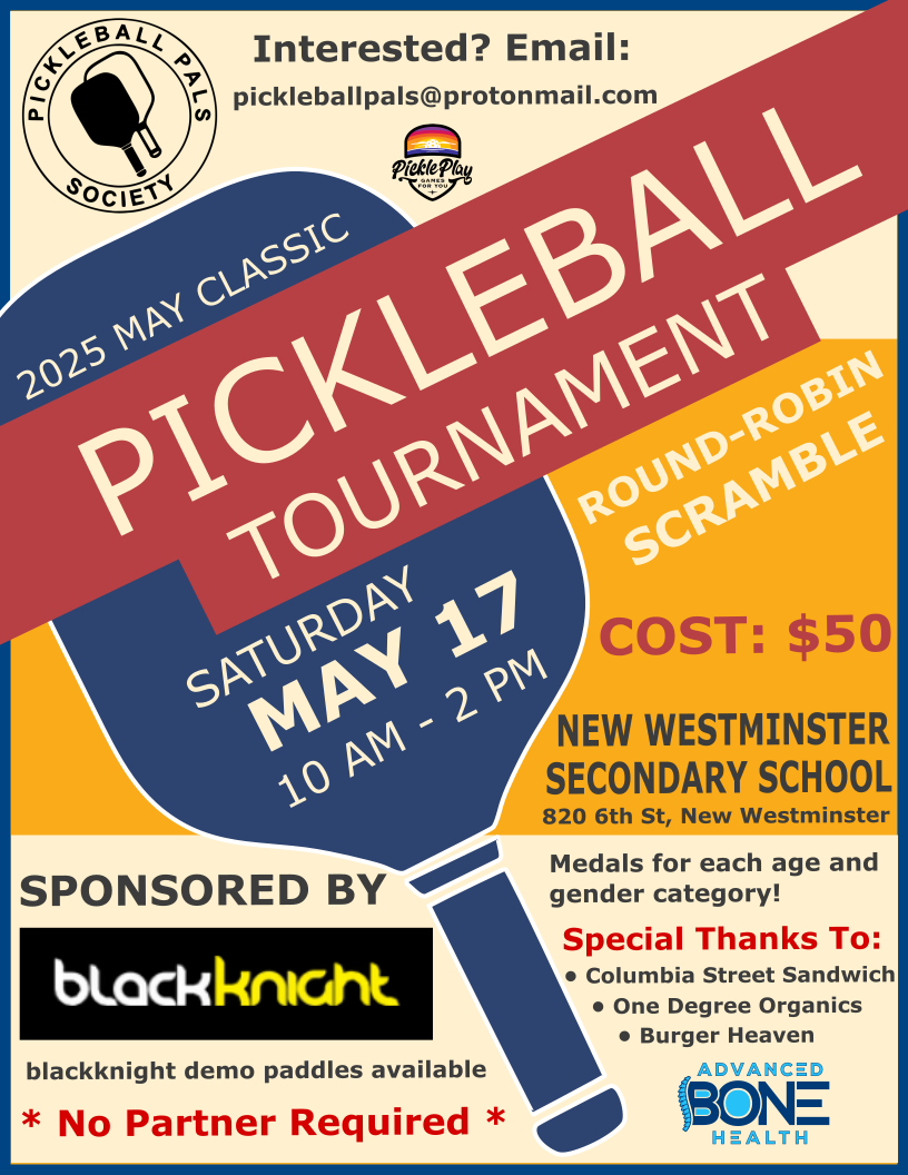 In a round-robin "scramble", you sign-up as an individual and play doubles matches with different random partners each game. Each participant will play 8 games. Games will be played to 11, win by 1. There will be no elimination rounds.